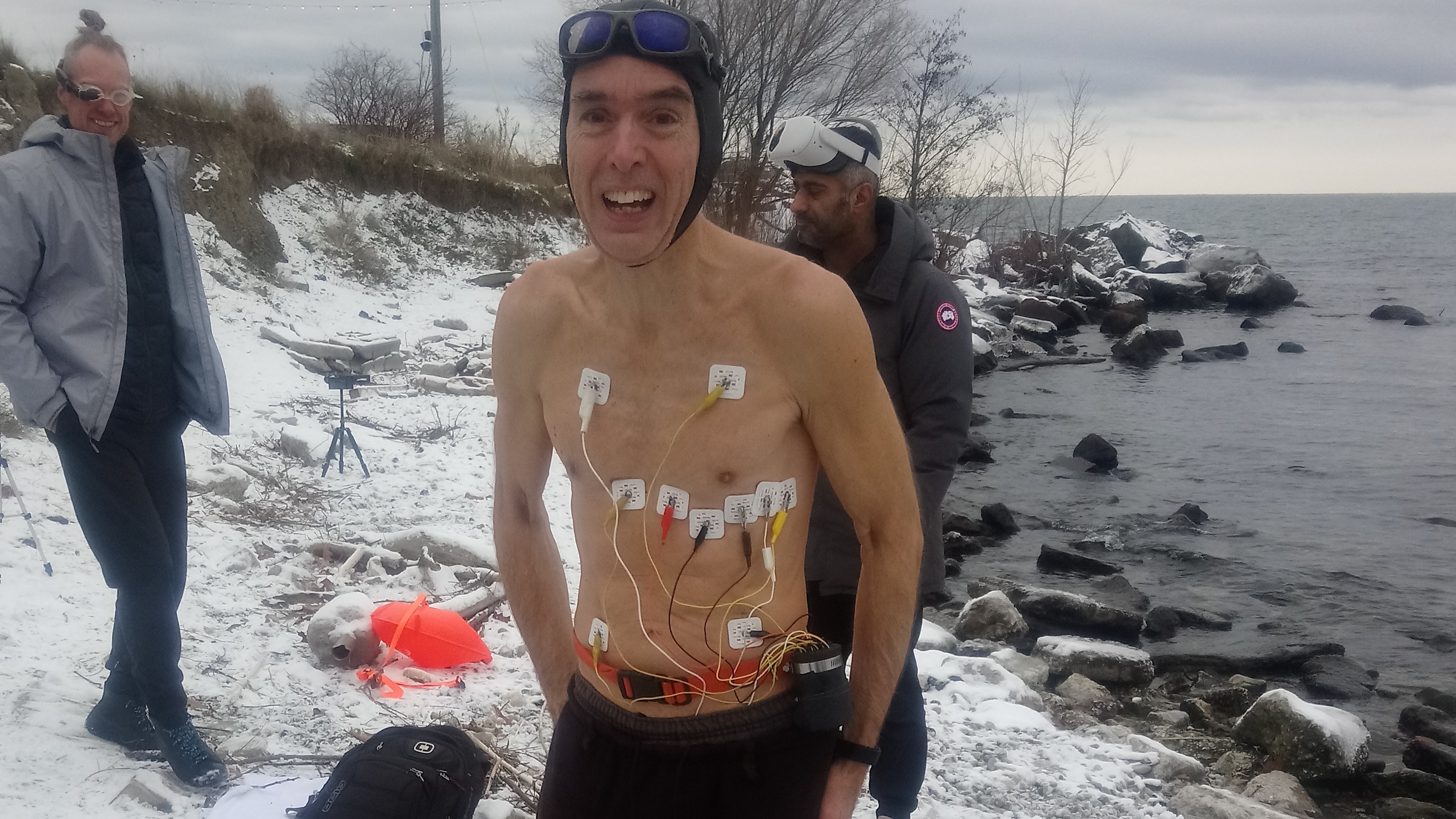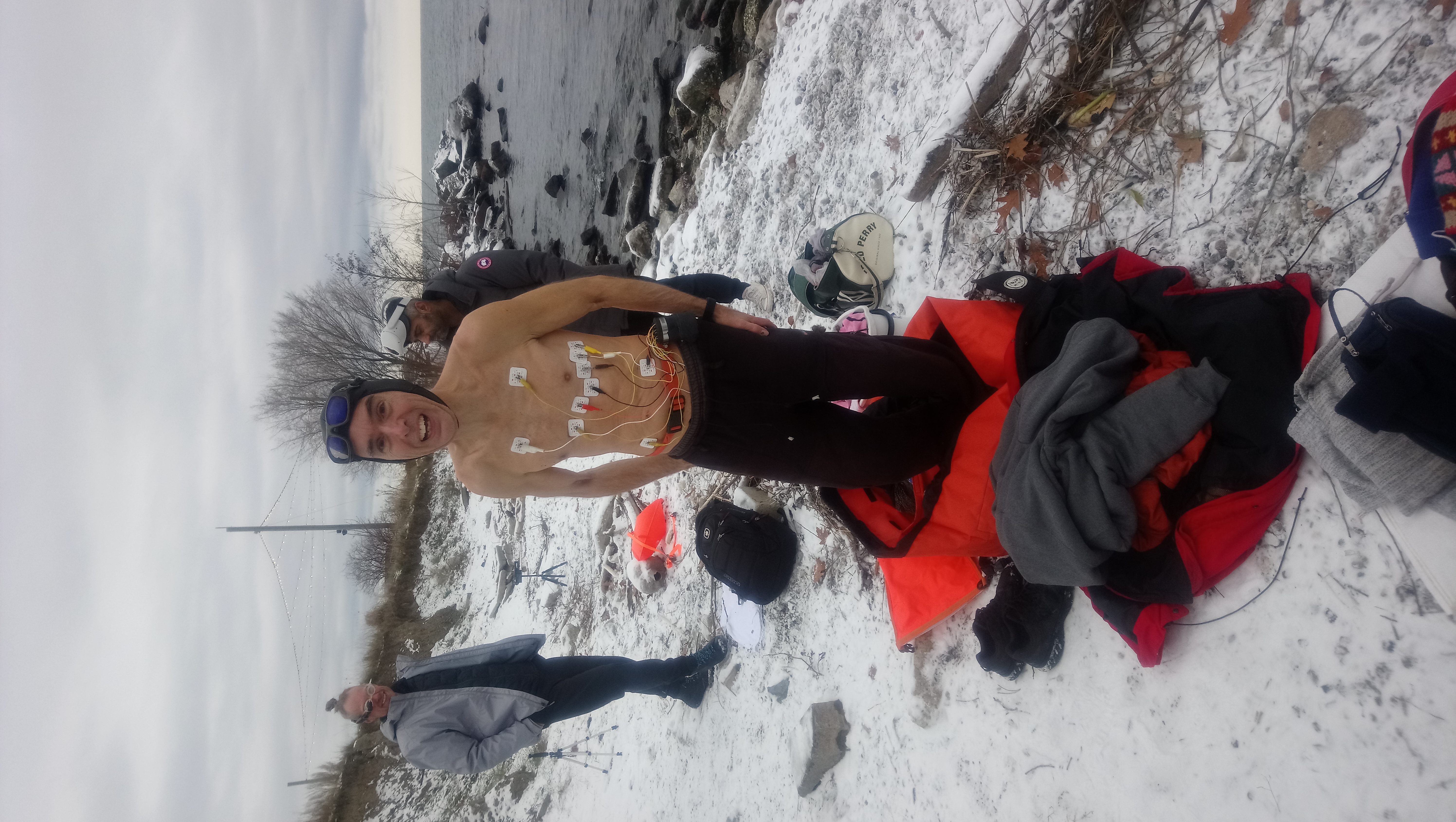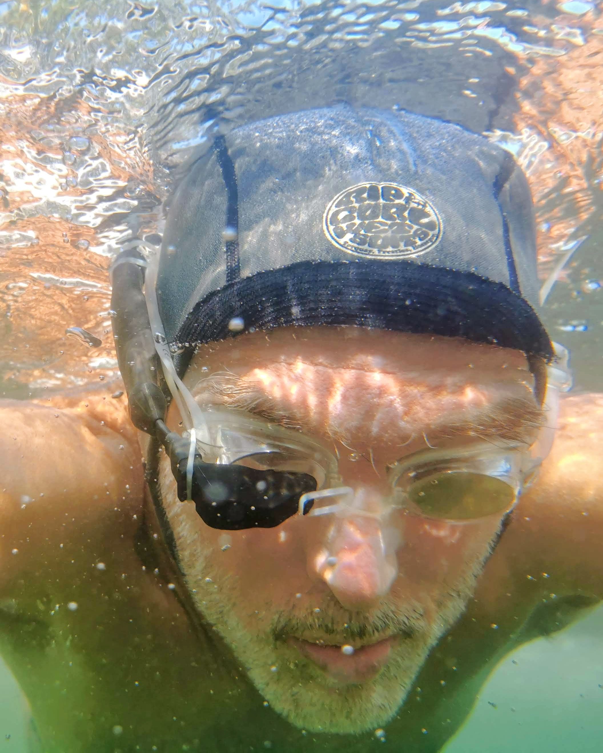 Two staff members from Swim Drink Fish doing water sampling and testing out the SmartSwim augmented reality eyeglasses: